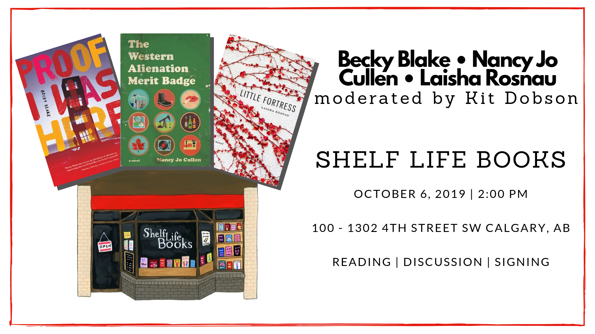 Please join Becky Blake, Nancy Jo Cullen and Laisha Rosnau at Shelf Life Books in Calgary on October 6, 2019 for a reading and discussion moderated by Kit Dobson.